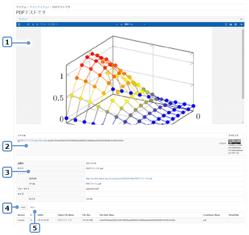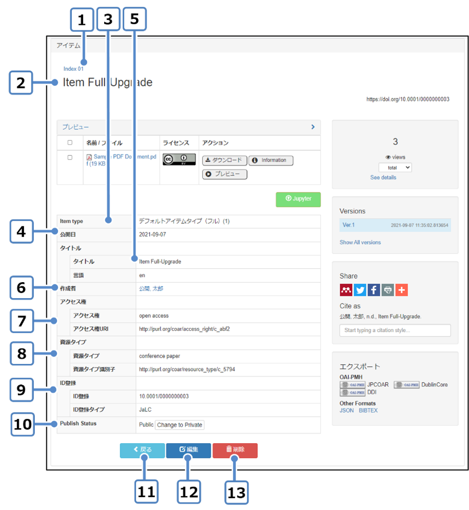 | 11 | コンテンツファイル情報 | アイテム登録時に選択された表示形式に応じて、コンテンツファイルの情報が表示されます。(表示形式については「アイテム個別登録」の「3.2.メタデータ入力」参照) |