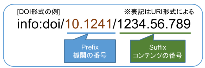 DOIは、プレフィックス(Prefix)とサフィックス(Suffix)をスラッシュ(/)で結合した形で記述されます。