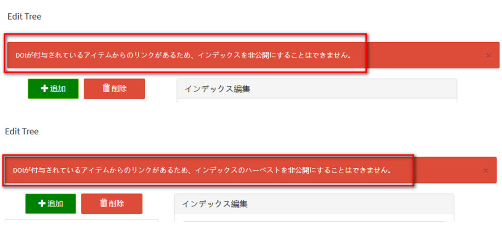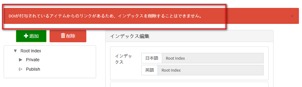 ※インデックスにDOIが付与されているアイテムが紐づいている場合、インデックスの削除はできません。