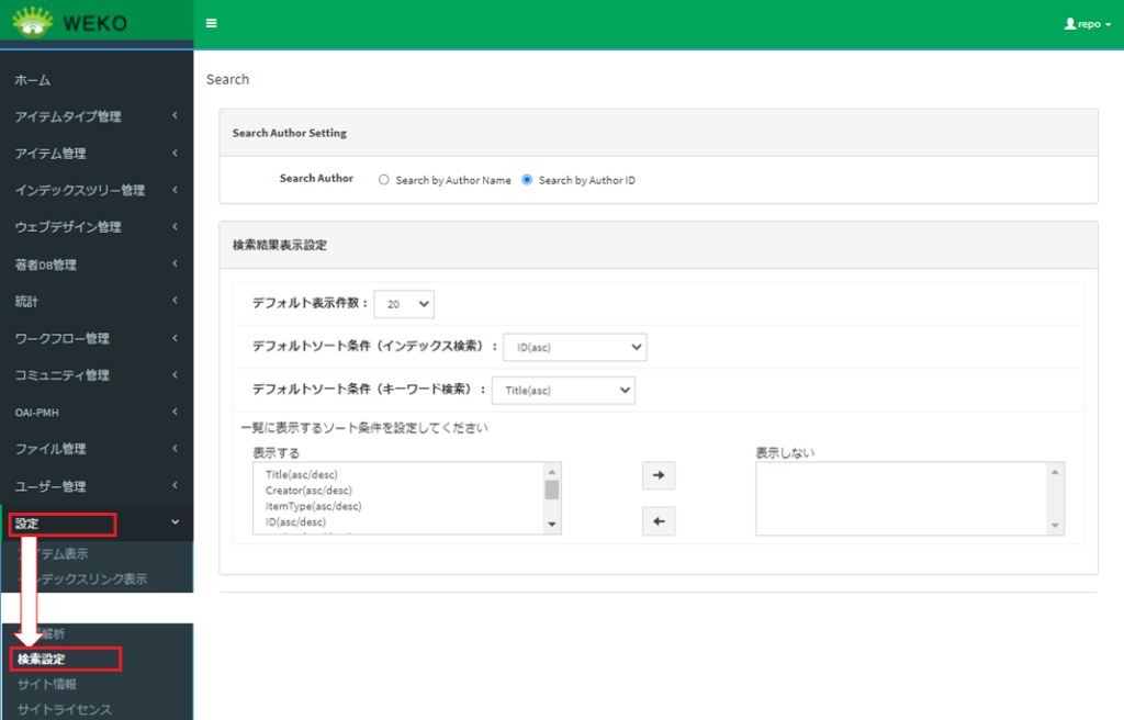 (1) ログイン後、[Administration]にアクセスし、[設定]をクリックして[検索設定]をクリックします。