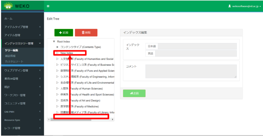 ログイン後[Administration]にアクセスし、[インデックスツリー管理]>[ツリー編集]で移動したいインデックスを希望の位置にドラッグして、ドロップします。