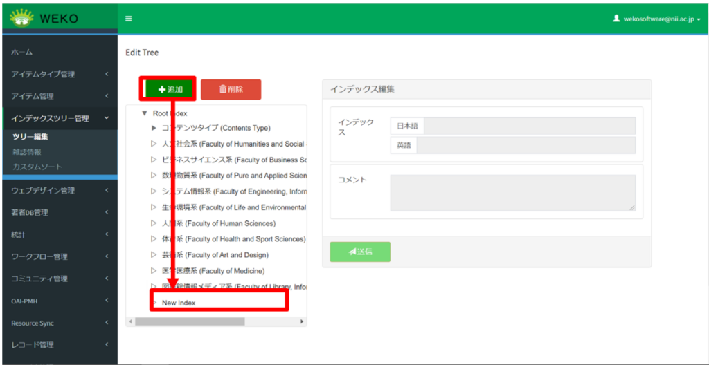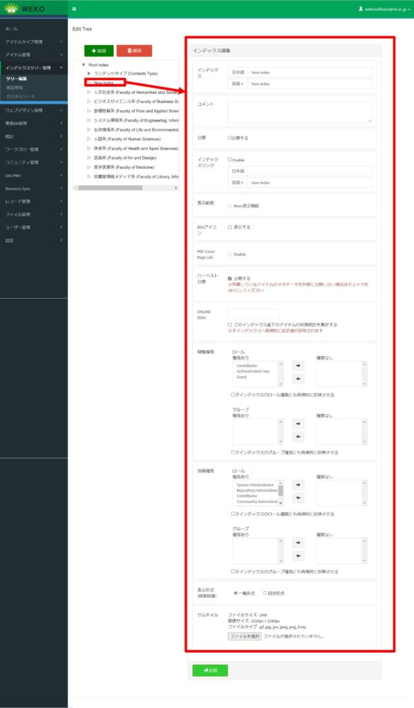 ログイン後[Administration]にアクセスし、[インデックスツリー管理]>[ツリー編集]でインデックスを選択して、[インデックス編集]に情報を入力します。