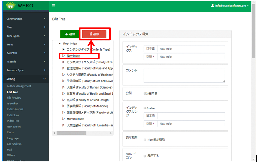 (1) ログイン後[Administration]にアクセスし、[インデックスツリー管理]>[ツリー編集]でインデックスを選択して、[削除]をクリックします。