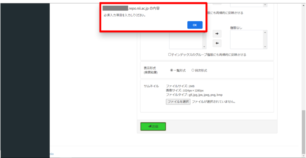必須項目を入力しない場合、インデックスが追加されずに、[必須入力項目を入力してください]というエラーメッセージが表示されます。また、必須項目の直下にエラーメッセージも表示されます。